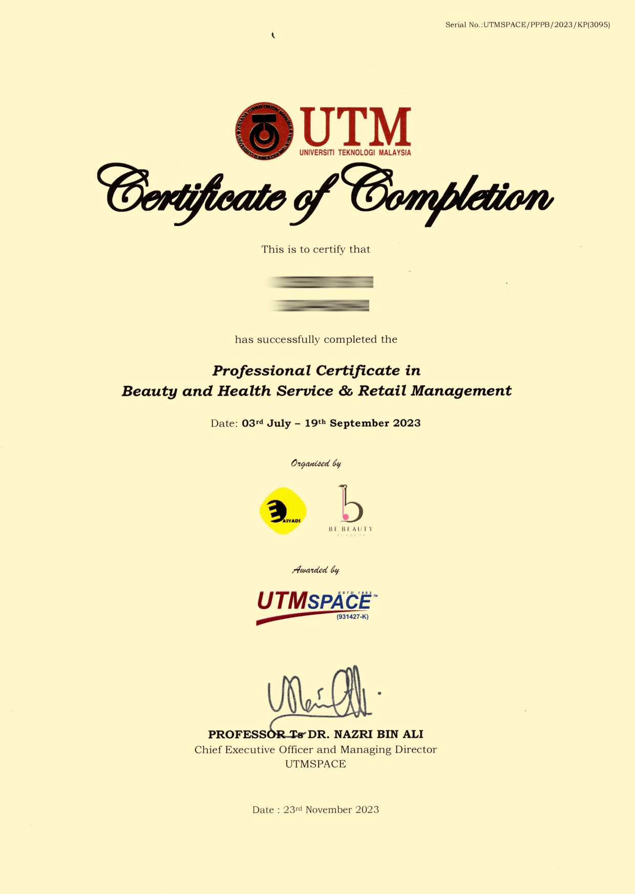 Through this strategic partnership, students enrolled in our Professional Certificate in Beauty and Health Service & Retail Management receive the best of both worlds: practical, hands-on training from Be Beauty Academy's industry experts, backed by the academic quality assurance of UTMSPACE (Universiti Teknologi Malaysia).