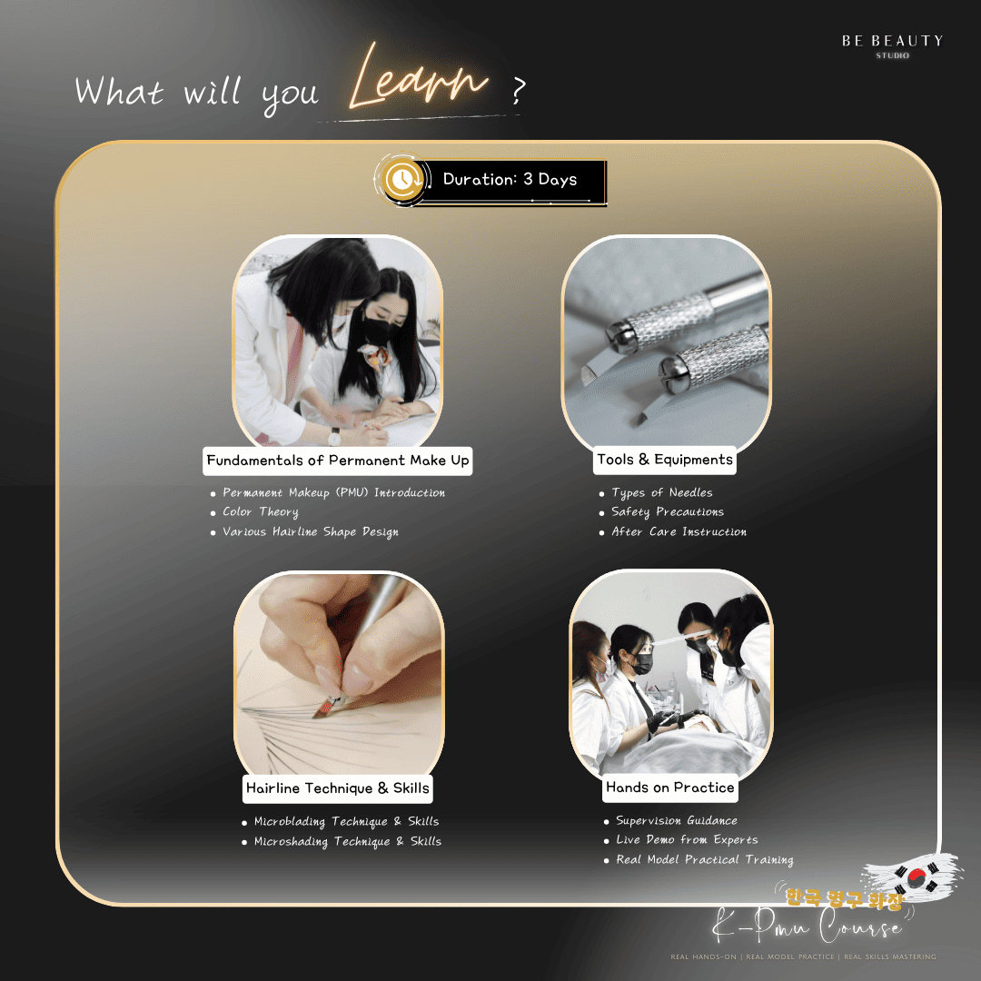 (1) An understanding of theories on permanent makeup industry, embroidery knowledge, and techniques on hairline embroidery as well as practical skills.