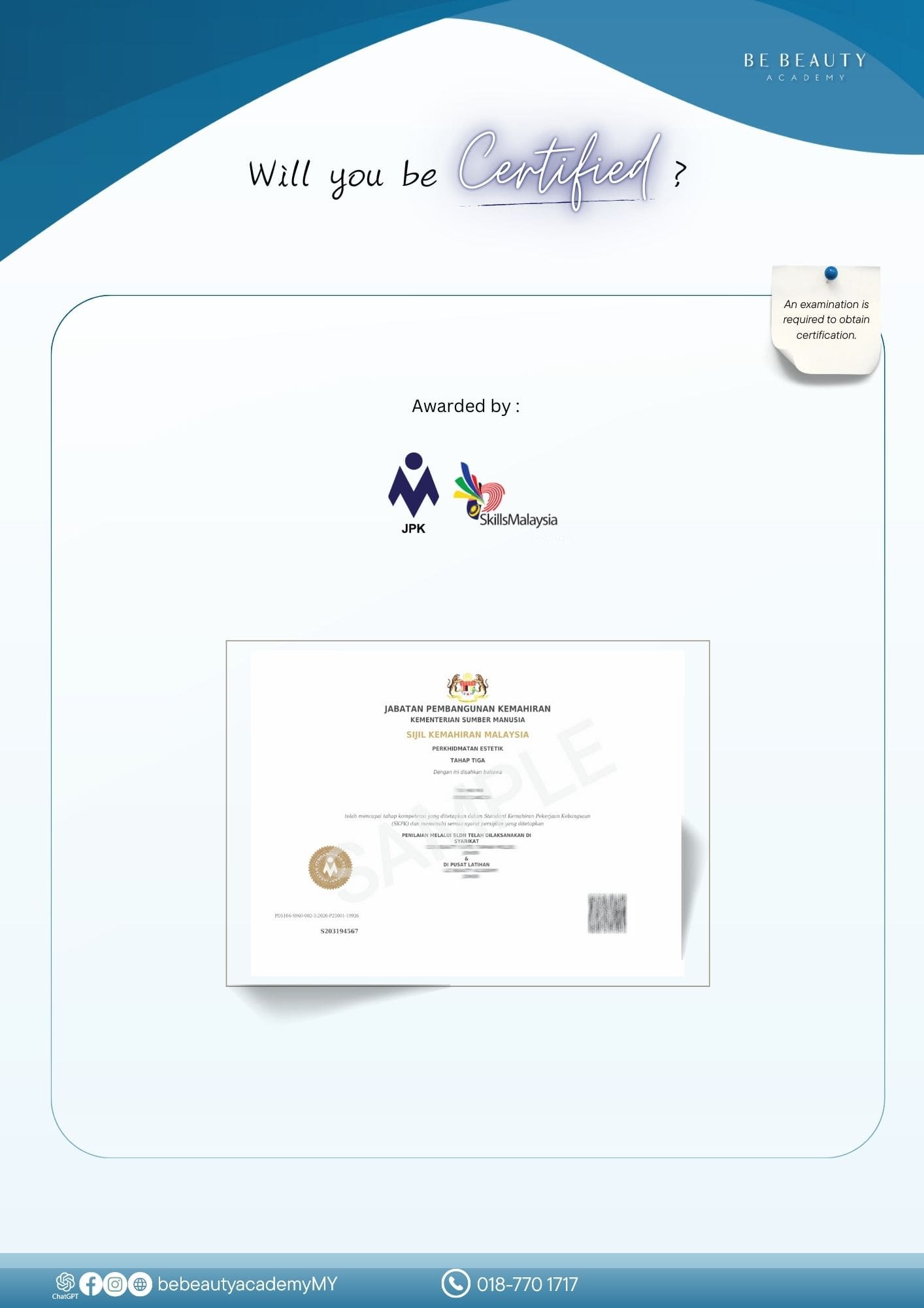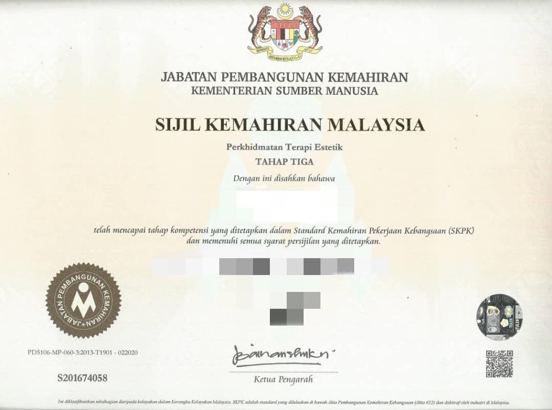 Upon completion of course, candidate will be qualified as Sijil Kemahiran Malaysia Level 1, 2 and 3 in beauty therapy awarded by Malaysia government JPK (www.dsd.gov.my).