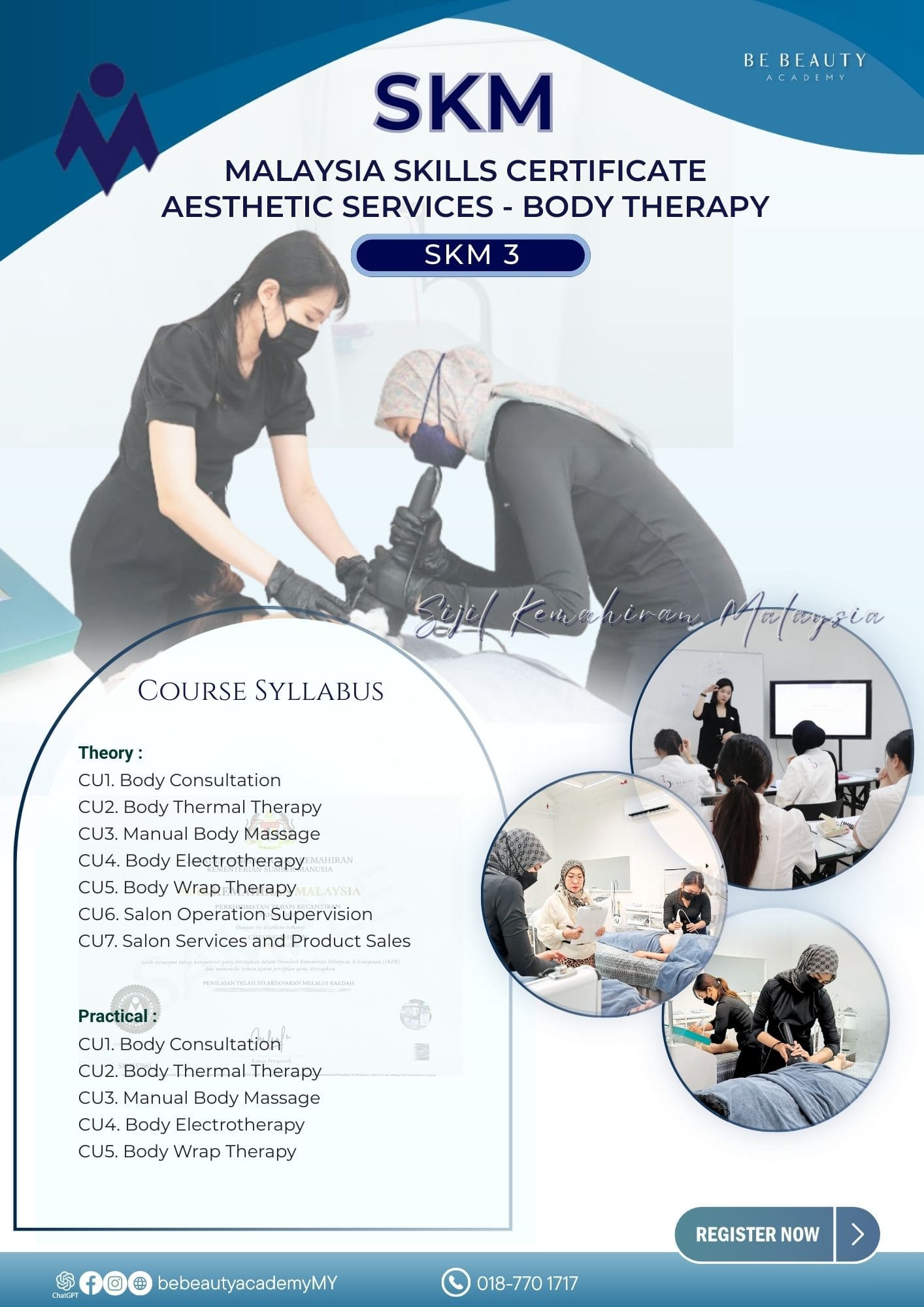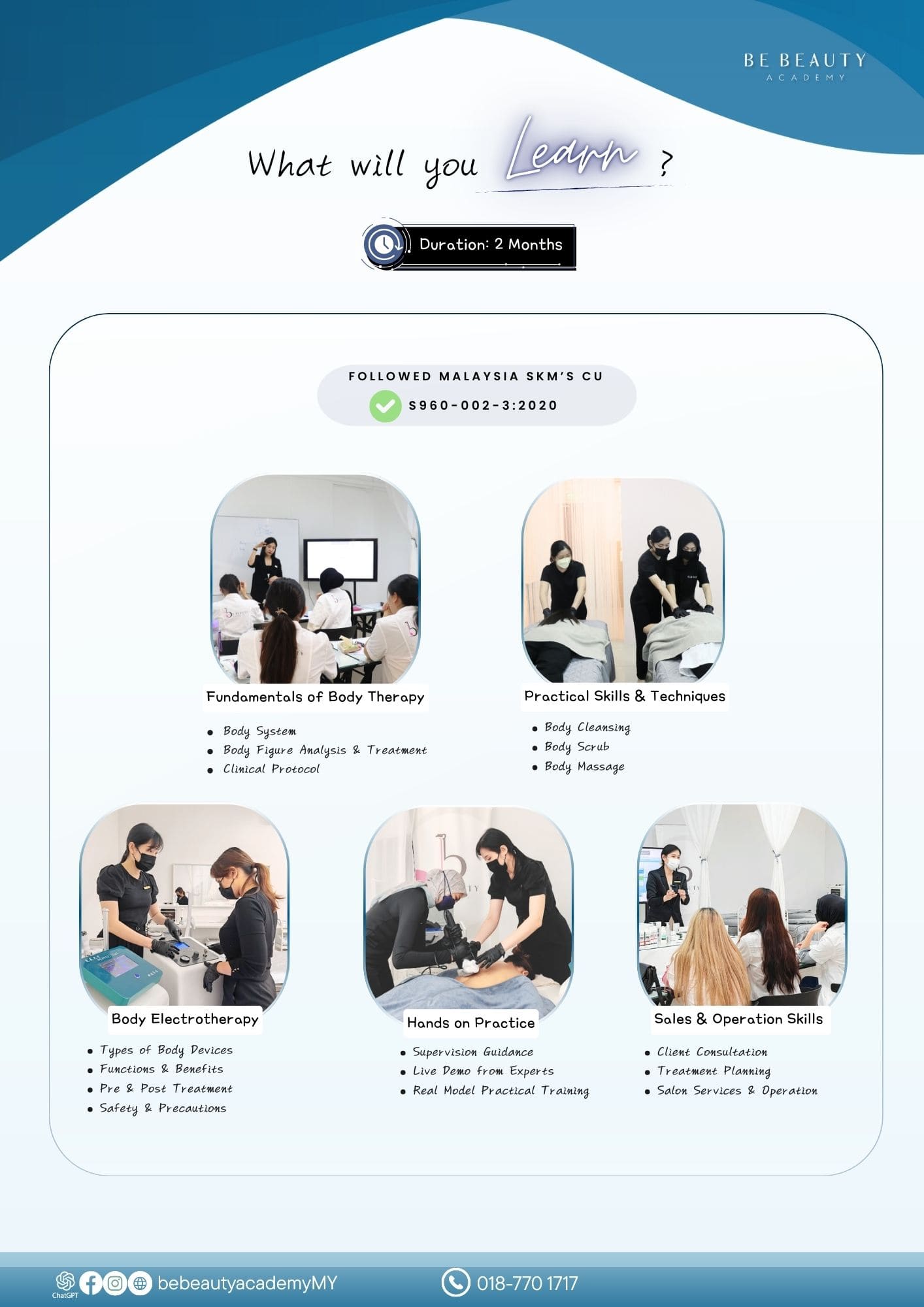 (2) Exposure on key areas including body therapy consultation, body wrapping, body electrotherapy, as well as salon operation supervision & promotion. in accordance to the CU of NOSS set by JPK- Jabatan Pembangunan Kemahiran (www.dsd.gov.my).