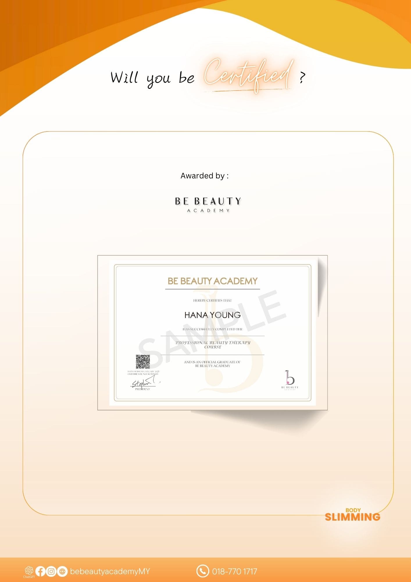 Setelah selesai kursus, calon akan layak sebagai Sijil dianugerahkan oleh Be Beauty Academy.