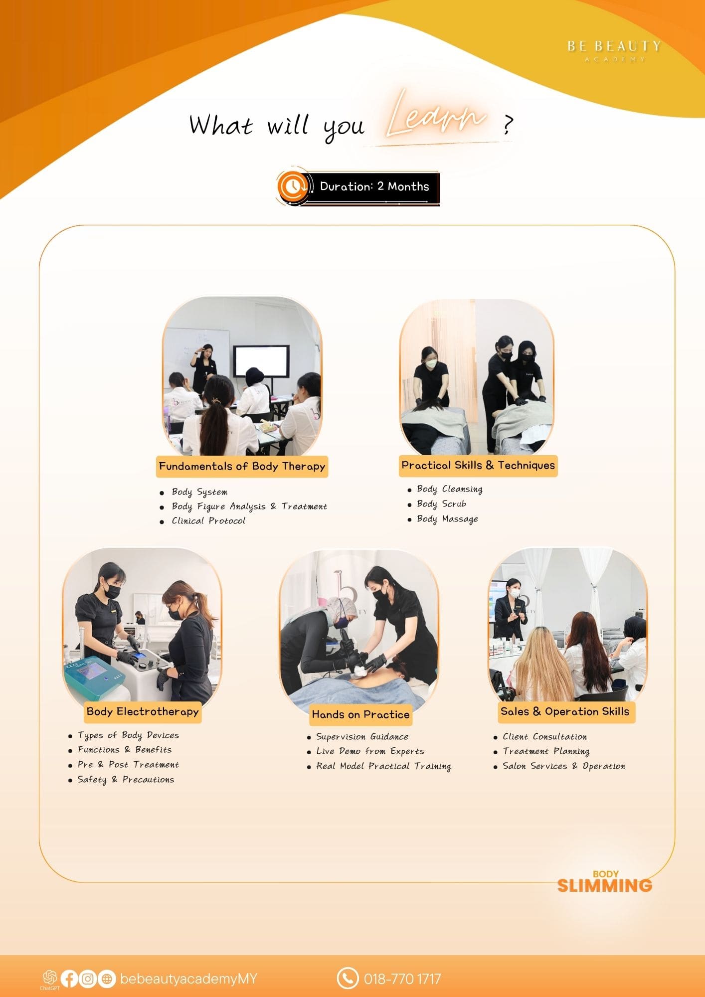 (2) Pendedahan mengenai bidang utama termasuk perundingan terapi badan, pelangsingan badan, pembungkus badan, elektroterapi badan, serta penyeliaan & promosi operasi salon.